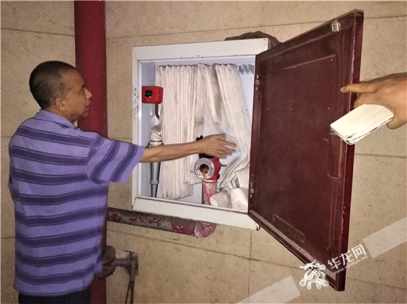 业主打开消防栓之后,没有水流出,敲击消防水管也是空荡荡的回声。记者张远勇 摄